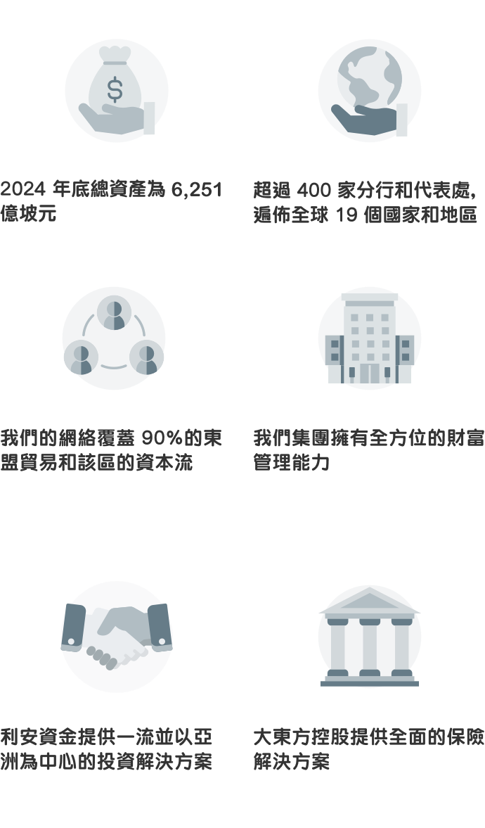 憑藉在亞洲的悠久歷史,我們在東盟和大中華區提供最全方位的服務,並在紐約、倫敦和悉尼等主要經濟體設有辦事處。以 「集團一體」策略及深厚的本地知識,助您實現跨地域的理想—無論是個人財富增長還是捕捉商機 —「心所向,行致遠」。
