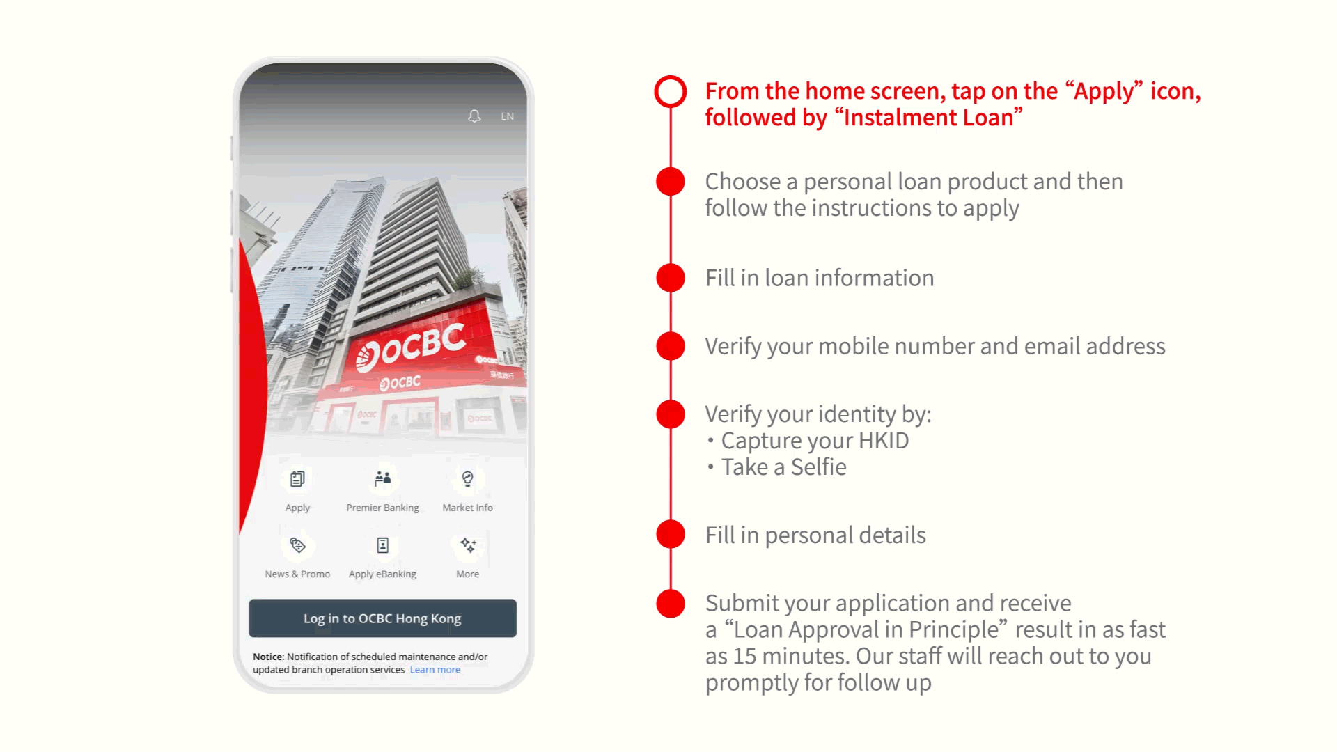 Customer can submit application through the loan centres and branches of OCBC Bank (Hong Kong) Limited (“the Bank”). To enquire the relevant terms and conditions, please contact the staff of the Bank.