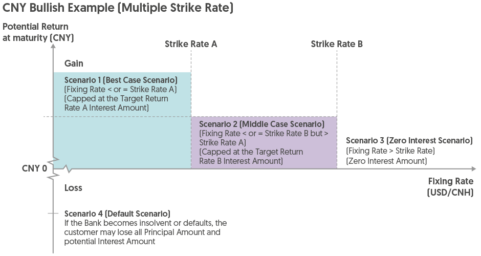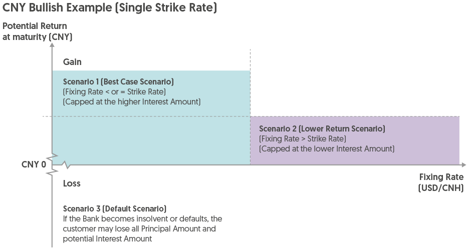 Assuming that the Fixing Rate is ABOVE Strike Rate (B), as elaborated in scenario 3 above, you will receive in cash the Principal Amount together with the Interest Amount (i.e. CNY100,000.00 + CNY0.00 = CNY100,000.00) payable in CNY on the Maturity Date. If you convert the CNY payments you receive back to USD, the amount you receive will be affected by the prevailing exchange rate between USD and CNY and you will suffer a loss once the prevailing exchange rate is above 6.1000 (USD/CNH).