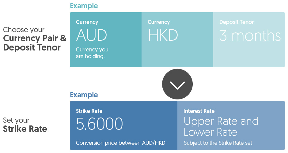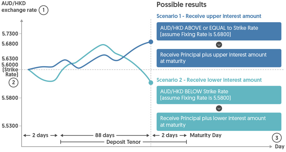 On the Exchange Rate Fixing Date (i.e 2 business days before the maturity date), compare the Strike Rate and the Fixing Rate (i.e. exchange rate of your currencies on Exchange Rate Fixing Date) to determine the amount of interest payable to you. You will receive 100% of the principal plus interest (either upper or lower) amount upon deposit maturity regardless of currency movement (note).