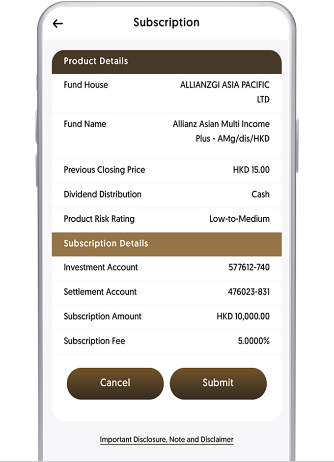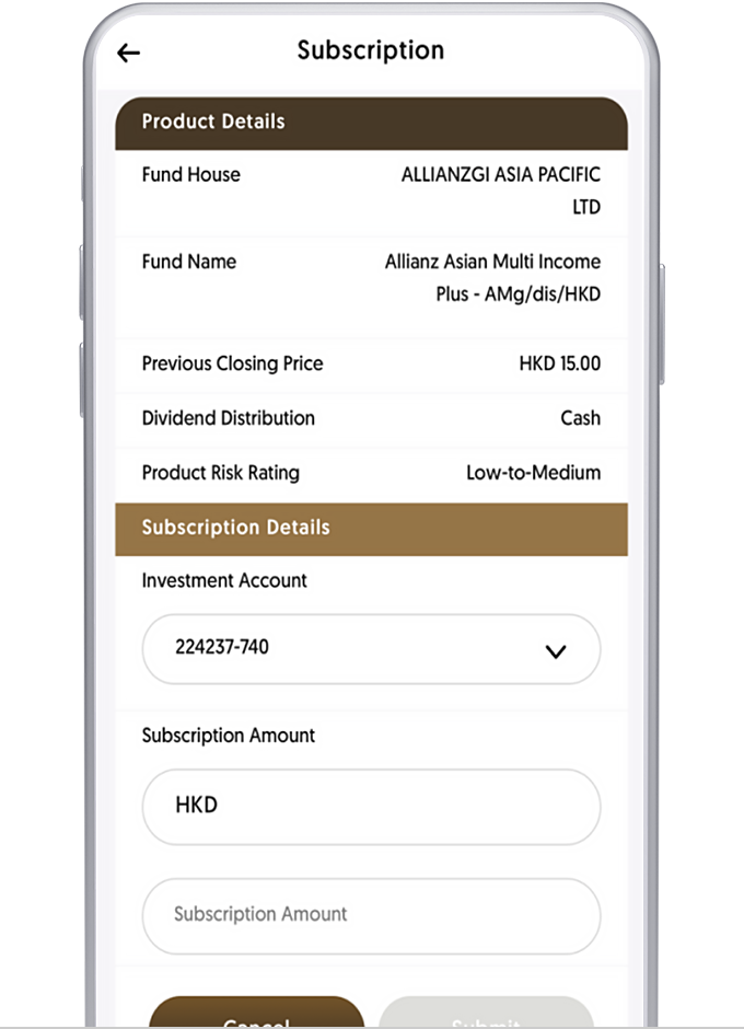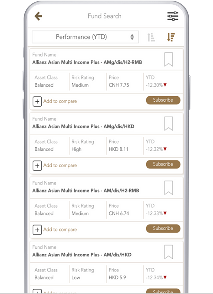 Please note that the unit price shown for each fund is based on its latest fund's NAV or its Bid price and is for reference only. The actual subscription price of each fund may be different to the reference offer price. All prices are subject to final confirmation by the Bank. Unit price information of each fund is shown in its denominated currency or reporting currency. Investment returns are denominated in the respective fund’s base currency (may be a foreign currency). You may be exposed to the risks of fluctuations in the exchange rate of USD / HKD / foreign currency.